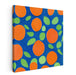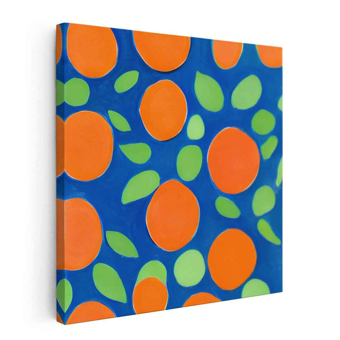 Introducing 'Neon Burst Melody: Vibrant Pop Art Orange and Blue Canvas Print,' a lively and engaging abstract piece that is a true feast for the eyes. This artwork features a striking composition of bright orange circles resembling ripe, juicy oranges set against a vibrant blue backdrop. Interwoven amidst the oranges are refreshing green leaf-like shapes, adding a dynamic contrast that enhances the energetic and lively essence of the artwork.