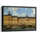 The artwork depicts a vibrant scene filled with elegantly dressed figures, horse-drawn carriages, and lively social interactions, set against the backdrop of a meticulously detailed palace facade. The classical architecture, adorned with ornate statues and a gilded roof, exudes a sense of historical luxury and sophistication.