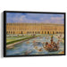 The painting beautifully portrays the majestic facade of the Palace of Versailles, gleaming in warm golden yellows under the sunlight, showcasing intricate details that speak of a bygone era of luxury and refinement. In the foreground, the grand canal bustles with life as elegantly dressed figures leisurely glide in various boats, creating a scene of festivity and leisure that exudes elegance and charm.