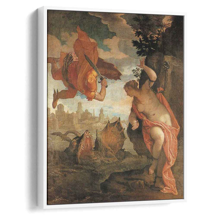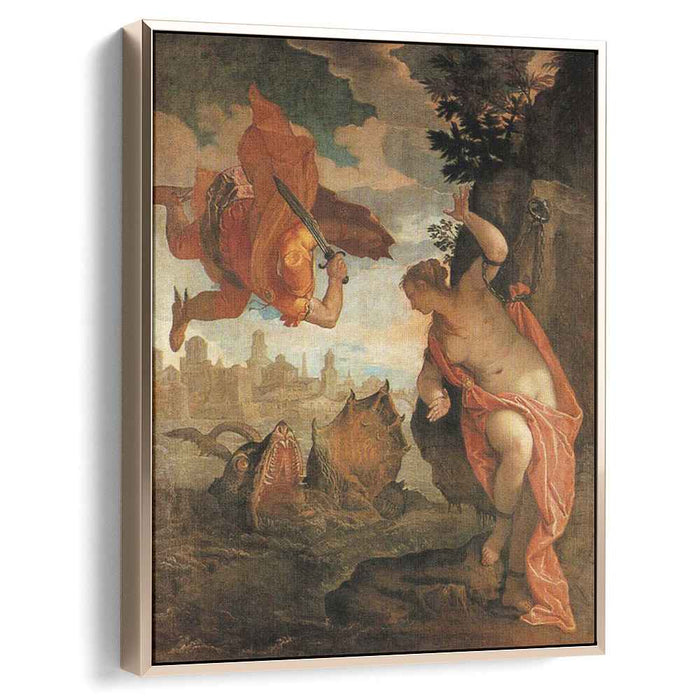 The painting depicts the thrilling moment when the mythical hero Perseus slays the monstrous sea creature, Cetus, and liberates the beautiful princess Andromeda. This ancient tale of heroism and sacrifice has captivated audiences for centuries, and Veronese brings it to life with exquisite detail and imagination.