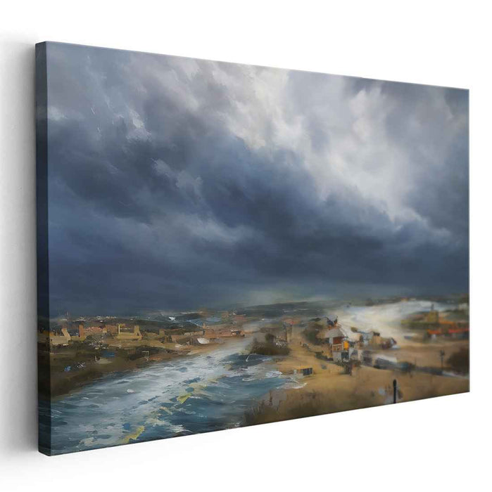 Introducing 'Raging Waters: Coastal Fury,' a captivating canvas art print that plunges viewers into the dramatic and immersive world of a tempestuous seascape. This artwork skillfully captures a coastal village standing on the brink of a storm's fury, creating a scene brimming with tension and raw energy.