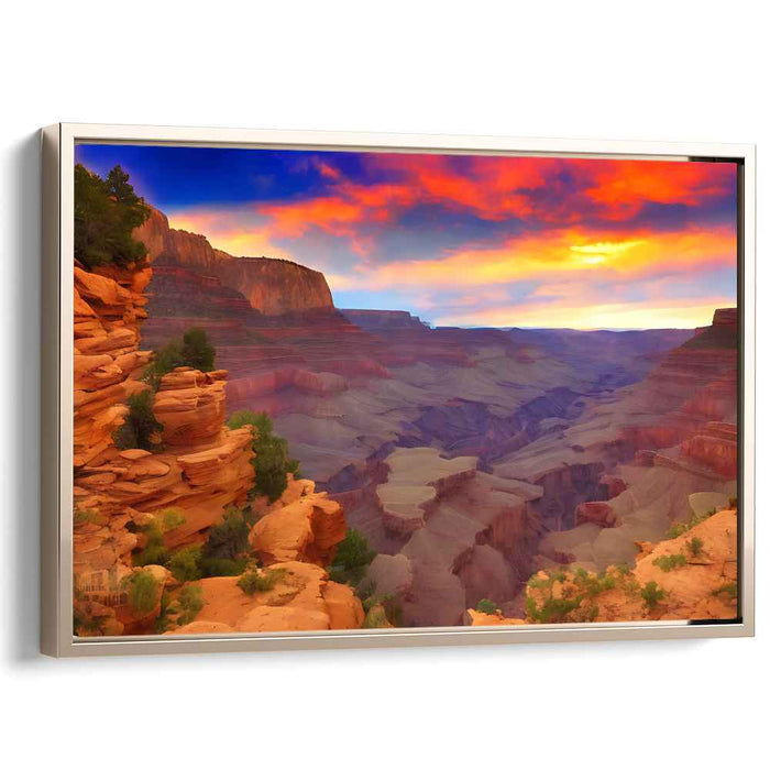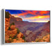 The canvas art features a sky ablaze with vibrant oranges, reds, and purples, casting a striking contrast against the earthy hues of the canyon. The play of light and shadow on the rocky surfaces adds depth and dimension, immersing the viewer in the scene and creating a sense of standing on the canyon's edge, marveling at its grandeur.