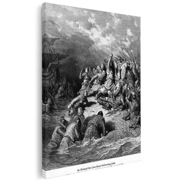 This museum-quality canvas print captures the full grandeur of Doré's original. "Richard I the Lionheart Delivering Jaffa" becomes a captivating centerpiece for any room, sparking conversations about history, heroism, and the enduring power of art.