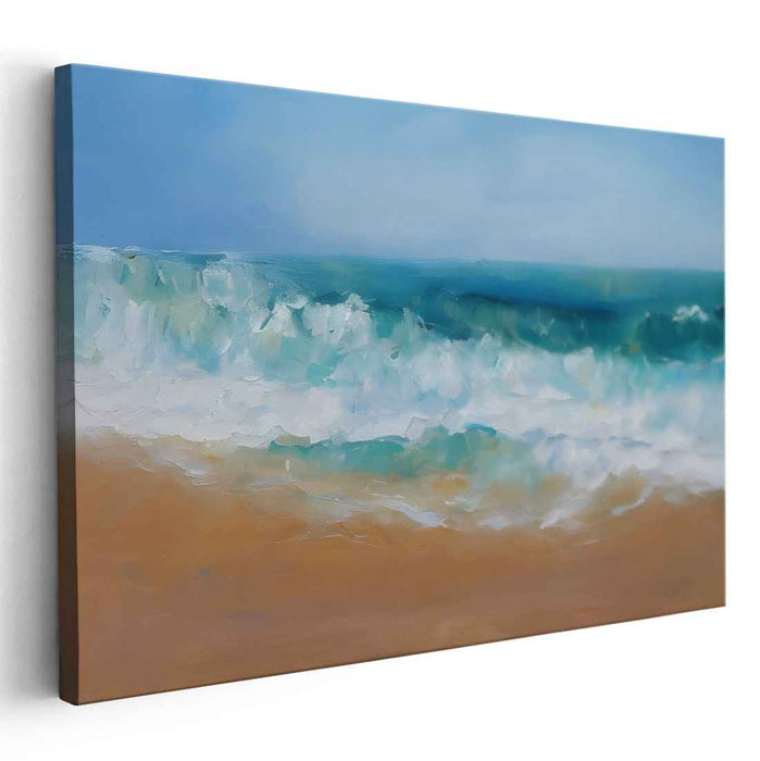 Step into the tranquility of 'Sailor's Journey Home: Luminous Seascape Canvas Art,' a mesmerizing piece that whisks you away to a peaceful beach setting, where the rhythmic dance of the waves captures the sheer grandeur of nature's beauty. This artwork showcases a meticulously crafted foreground of glistening golden sands that guide the gaze towards the turbulent yet gracefully foaming white-capped waves. The ocean, depicted in a rich spectrum of deep blues and vibrant turquoises, harmonizes strikingly against a gentle, sun-kissed sky.