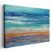 The upper part of the painting is a dance of deep and light blues, creating a lively sky adorned with fleeting clouds. Below, layers of turquoise, azure, and hints of white form the sea, capturing the rhythmic, rolling waves of the ocean. The horizon comes alive with warm hues - golden yellows, sandy oranges, and muted browns, reminiscent of a serene sunset or a sandy beach.
