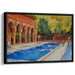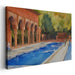The focal point of this artwork is the tranquil pool surrounded by elegant arched colonnades on the left, painted in warm terracotta tones that beautifully contrast with the cool blues of the water. The intricate detailing of the arches blends Moorish and classical influences, infusing the scene with a rich sense of history and sophistication.