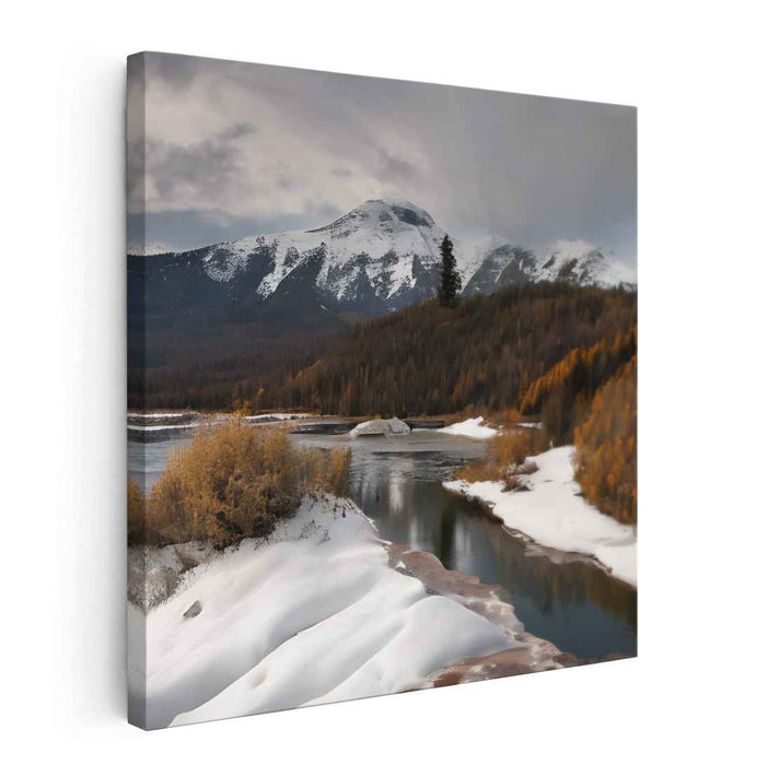 Step into the tranquility of the "Serene Winter Landscape: Snowy Mountains and Tranquil River," a mesmerizing canvas art that transports viewers to a serene winter wonderland, capturing nature's peaceful essence in a breathtaking composition. The artwork features a majestic snow-capped mountain dominating the backdrop, its rugged peaks and slopes meticulously detailed, exuding a timeless grandeur against the moody, overcast sky.