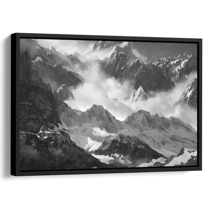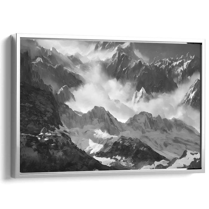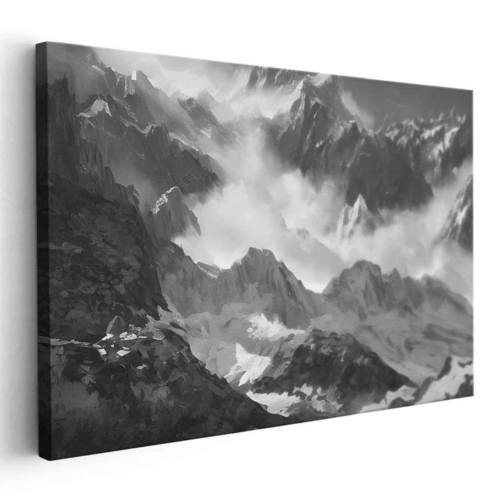 Introducing the breathtaking "Shadows Whispering on Silent Hills" canvas art print, a captivating masterpiece that transports viewers to a world of awe-inspiring landscapes dominated by rugged mountains veiled in mystical mist. This dramatic artwork, rendered in a mesmerizing monochromatic palette, immerses the observer in a scene where shades of grey create a profound sense of depth and texture, inviting exploration and contemplation.