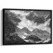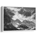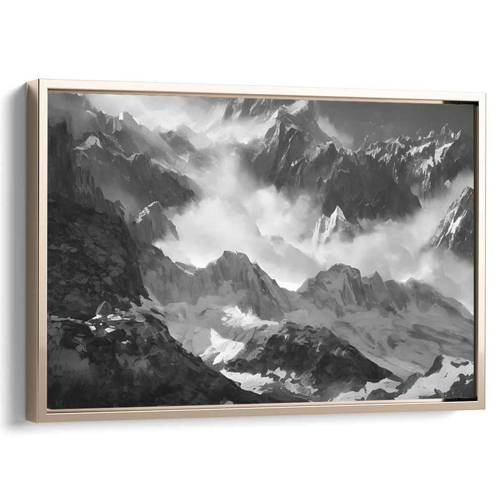The primary color scheme of greys in varying intensities infuses the artwork with a rich tonal range, accentuating the rugged beauty of the mountains and the delicate interplay of light and shadow on their snow-clad slopes. Complemented by subtle whites and blacks, the secondary colors enhance the contrast, emphasizing the intricate details of the jagged peaks and enhancing the overall visual impact of the composition.