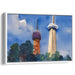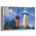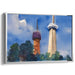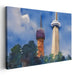 Introducing "Skyward Towers: Watercolor Cityscape Serenity," a mesmerizing cityscape canvas art that transports viewers into a serene urban panorama, dominated by two distinct towers set against a deep blue sky. The taller tower, standing elegantly on the right, boasts a modern design with a cylindrical base and a sharp spire culminating in an observation deck, its beige facade starkly contrasting the azure heavens above. On the left, a shorter tower exudes a more rustic charm, transitioning from a reddish-brown base to a darker, dome-like top, evoking a sense of historical grandeur.