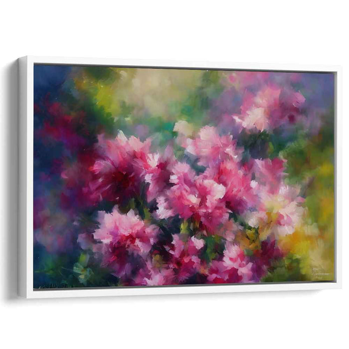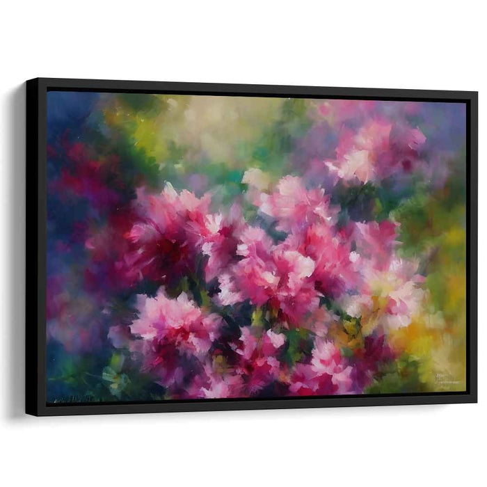 Introducing "Soft Petal Gaze," a mesmerizing impressionist pink floral canvas art print that encapsulates the enchanting beauty of blooming flowers in a vibrant explosion of color. This exquisite piece features a lush array of pink flowers harmoniously set against a backdrop of rich greens, blues, and purples, creating a captivating visual symphony.