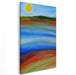 The upper left corner of the painting is dominated by a radiant sun, illuminating the scene with its golden rays and infusing the entire composition with a sense of ethereal light. Below the sun, a verdant hill unfolds, stretching across the horizon in a soothing expanse of greenery. A tranquil body of water reflects the azure sky above, its gentle waves depicted in soft, undulating strokes that evoke a serene sense of movement and peace.