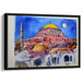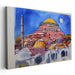 Introducing the "Spectral Skyline Symphony," a mesmerizing watercolor canvas art print that transports viewers to the architectural wonder of Istanbul, Turkey. This captivating artwork beautifully captures the grandeur of the iconic Hagia Sophia, showcasing its majestic dome and intricate minarets basking in the golden light of the setting sun.