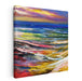 The horizon is adorned with a palette of deep purples and oranges, reminiscent of the early rays of sunrise, while the sea mirrors a myriad of blues and greens, adorned with frothy white crests that hint at the ocean's lively spirit. The foreground is a vibrant mosaic of yellow, red, pink, and white, evoking the mingling of sand and shore in a harmonious dance of hues.