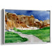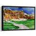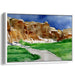 The cliffs, depicted in rich shades of ochre, sienna, and burnt umber, exude a sense of depth and realism through subtle variations in color. Below them, a lush green expanse unfolds, adorned with a winding path that guides the viewer's gaze into the scene. The vibrant greens of the grass harmonize beautifully with the rocky tones above, creating a visually striking balance.