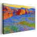 Introducing "Sunlit Desert: Vibrant Landscape Canvas Art Print," a mesmerizing piece that transports viewers to a sun-drenched desert oasis, where the vibrant colors of nature take center stage. This captivating artwork showcases towering rock formations in the foreground, bathed in a rich palette of reds and oranges, juxtaposed beautifully against cool blues and purples that define their shapes with dramatic flair.