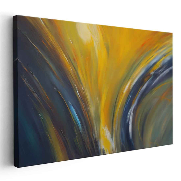 Introducing "Sunlit Soul Symphony," an abstract expressionist canvas art print that mesmerizes viewers with its captivating interplay of colors and dynamic movement. The artwork's primary color, a radiant yellow, exudes warmth and energy, enveloping the canvas in a luminous glow. Against this backdrop, deep blues, greens, hints of orange, and white swirl elegantly, creating a play of light and shadow in perpetual motion.