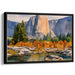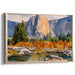 The foreground of the painting depicts a tranquil river meandering through a vibrant display of autumnal trees, their leaves ablaze in shades of oranges, yellows, and hints of red. These vivid hues harmonize beautifully with the cool blues and greens of the river and distant pine trees, creating a visual symphony of nature's seasonal transformation.
