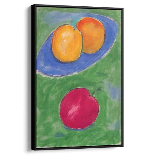 The artist employs thick, black outlines reminiscent of stained glass or the cloisonné technique to define the fruit shapes, infusing the piece with a contemporary and graphic edge. The use of broad, expressive brushstrokes and bold colors imbues the artwork with a sense of liveliness and movement, capturing the essence of the bountiful tropical harvest.