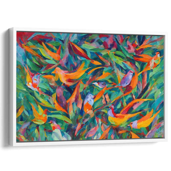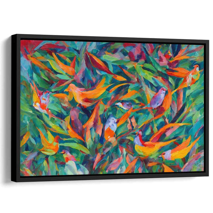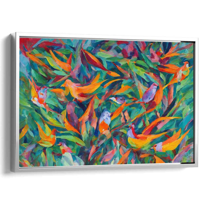 Immerse yourself in the enchanting world of "Tropical Canopy Serenade: Tropical Birds in Lush Foliage," a captivating canvas art that breathes life and color into any space. This dynamic artwork showcases a vibrant tropical landscape teeming with birds, a kaleidoscope of colors dominating the scene with fiery oranges and lush greens, creating a vivid and energetic ambiance.