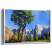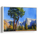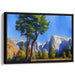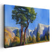 The artwork showcases a pair of tall, intertwined trees with lush green foliage set against a backdrop of sunlit cliffs and mountains. The clear blue sky provides a striking contrast, enhancing the vibrancy of the natural elements. The artist's skillful use of primary colors like rich blues in the sky and secondary colors such as various shades of green, earthy browns, and warm golden hues in the foliage creates a harmonious and visually appealing composition.
