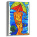 The artwork exudes a whimsical and dreamlike quality, inviting viewers into a fantastical world where reality and imagination intertwine seamlessly. The central figure, intertwined with nature elements and an umbrella emerging from her head, adds a touch of playfulness and intrigue, making it a thought-provoking centerpiece for any space.