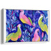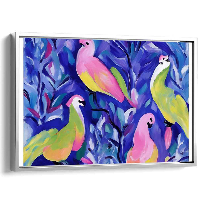 The focal point of the piece is the four parrots, each adorned in striking hues of pink, green, yellow, and white, set against a swirling mix of blue and purple in the background. The artist's expressive brushwork style infuses the painting with movement and spontaneity, enhancing the overall vibrancy and dynamism of the composition.