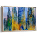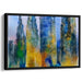 The cityscape bursts with primary hues of blue and yellow, interwoven with secondary tones of green, orange, and hints of pink, creating a visual symphony of depth and contrast. The buildings are a mix of sharp lines and blurred edges, blending structure with fluidity, inviting viewers to immerse themselves in the urban dynamism captured on canvas.