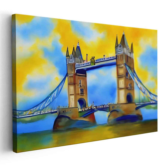 Introducing the mesmerizing "Urban Tapestry: Big Ben" canvas art print, a vibrant and dynamic portrayal of the iconic Tower Bridge in London that breathes life into this historic landmark with a burst of colors and energy. This captivating artwork masterfully uses a vivid palette dominated by a striking blue and a rich yellow, creating a powerful contrast that makes the bridge pop against a dreamlike sky.