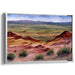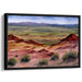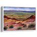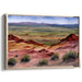The foreground of this piece is a rugged, rocky terrain bathed in a rich symphony of reds, oranges, and browns, capturing the essence of the desert's warmth and rugged beauty. Delicate patches of desert flora add texture and a hint of vitality to the arid setting. As your gaze travels towards the horizon, the rocky terrain yields to a vast, lush plain painted in a spectrum of greens, hinting at a fertile valley or oasis in the distance.
