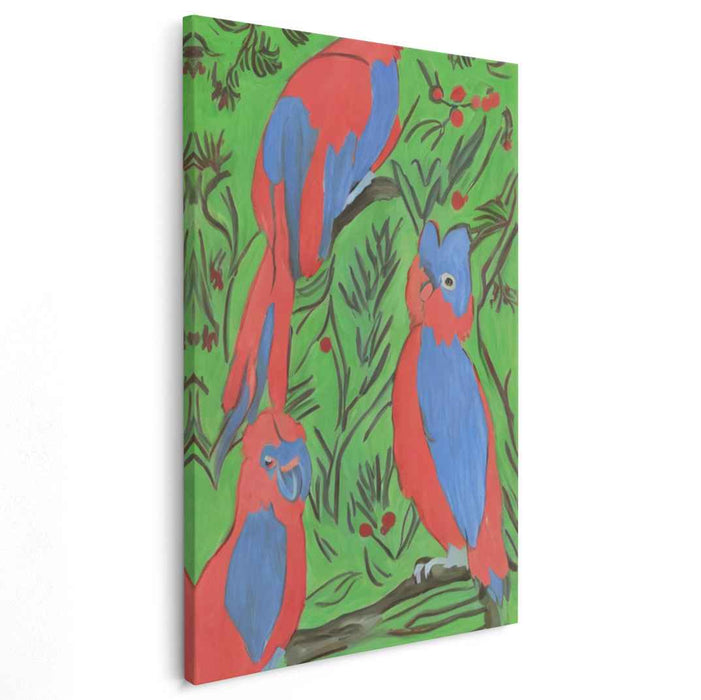Introducing "Vibrant Parrots in Lush Foliage," a captivating Fauvist nature canvas art print that brings the vivacity of nature indoors with a burst of color and energy. This striking artwork features three intricately detailed parrots perched amidst a backdrop of lush green foliage, creating a lively and energetic ambiance that is sure to uplift any space.