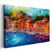 Introducing 'Vibrant Seaside Escape: Mediterranean Charm in Bold Colors,' a captivating landscape canvas art that transports viewers to a bustling coastal village, brimming with the allure of the Mediterranean. This dynamic artwork bursts with a kaleidoscope of colors, predominantly showcasing buildings painted in warm hues of red, orange, and yellow, harmoniously set against the deep blue waters of the harbor.