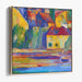 The central building, illuminated in a striking yellow hue, exudes warmth and invites exploration. Surrounding it, a harmonious blend of rich reds, deep blues, and lush greens creates a dynamic and lively village atmosphere. The artist's confident brushstrokes bring the rooftops and structures to life, showcasing a spontaneous and emotive technique that engages the viewer.
