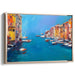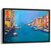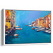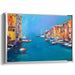 The primary colors of the piece, vivid blues for the sea and sky, harmonize with the warm tones of the buildings and boats, creating a visually striking composition that exudes an uplifting and serene mood, evoking feelings of relaxation and wanderlust. This artwork is a perfect addition to spaces like the living room, dining area, or office, where its dynamic composition and vibrant colors can be admired and cherished.