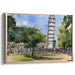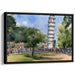 The focal point of this piece is the Watercolor Wonder, elegantly standing askew against a backdrop of a serene blue sky. The artist's skillful use of white and grey hues brings out the intricate architectural details of the tower, exuding a sense of timelessness and beauty. The lush greenery surrounding the tower provides a refreshing contrast, infusing the scene with vibrancy and tranquility.