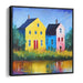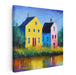 Introducing "Waterfront Quaint Abodes: Colorful Houses Reflected in Water," a captivating landscape canvas art that transports viewers to a tranquil riverside setting adorned with three vibrant houses. The central bold yellow house stands majestically amidst a sky-blue house on the left and a soft pink house on the right, each meticulously detailed with contrasting doors and windows, infusing the scene with charm and depth.