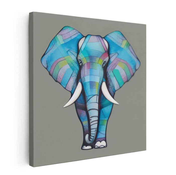 The artist skillfully employs a patchwork of geometric shapes and patterns, predominantly in shades of blue, complemented by secondary hues of green, purple, and pink. The bold lines and blocks of color create a stained-glass effect, adding depth and dimension to the artwork, while the neutral background accentuates the colorful elephant, making it the focal point of the composition.