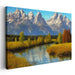 Introducing the captivating "Whispers Of Fall Stream: Autumn River Landscape" canvas art print, a breathtaking masterpiece that transports viewers to a mountainous paradise where nature's grandeur unfolds in all its splendor. This awe-inspiring artwork showcases a majestic range of snow-capped mountains that tower magnificently against a clear, azure sky, instilling a profound sense of admiration for the natural world.