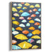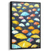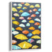 The umbrellas, painted in a lively palette of vibrant yellows, oranges, blues, and whites, pop against the dark canvas, exuding a sense of dynamic energy and playfulness. The artist's bold brushstrokes and slightly impressionistic style infuse the umbrellas with a feeling of motion, as if they are swaying gently in a whimsical breeze. The composition, with umbrellas scattered in a harmoniously random arrangement, invites viewers to revel in the cheerful chaos of colors and shapes.
