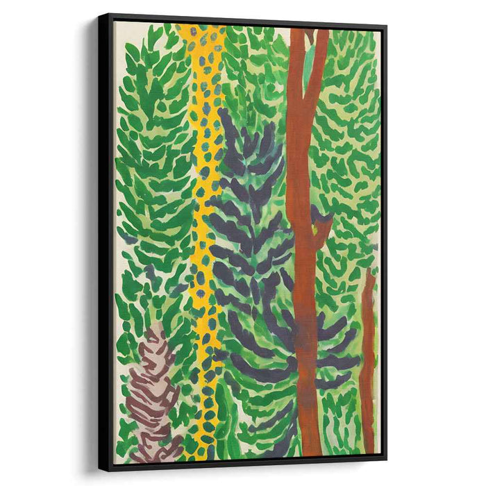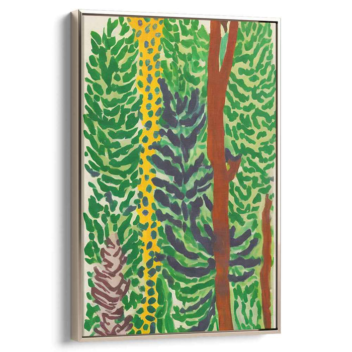 The composition leans towards abstraction, simplifying and exaggerating tree and leaf forms to emphasize the interplay of colors and shapes. This approach allows the audience to engage deeply with the artwork's vibrant palette and rhythmic patterns, offering a fresh perspective on the enchanting chaos of a forest setting.