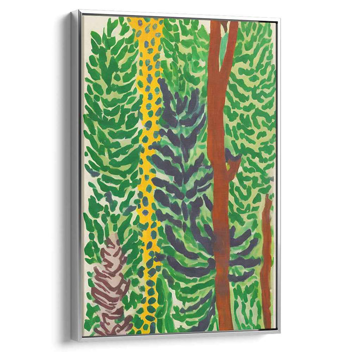 The artwork bursts with vibrant greens, breathing life into the dense foliage, while the sturdy tree trunks are painted in rich browns and deep reds, grounding the lively scene. Splashes of bright yellow dance playfully among the leaves, infusing the composition with light and warmth. Subtle hints of purple and blue add depth and contrast, enriching the forest's diversity and visual allure.