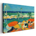 The artist's bold and sweeping brushstrokes infuse the artwork with a sense of movement and vitality, reminiscent of the Fauvist movement's emphasis on vibrant colors and expressive forms. The rich blue of the sky and sea serves as a striking backdrop to the bright orange umbrellas and beach accessories, while shades of green, yellow, red, white, and black add depth and contrast to the composition.