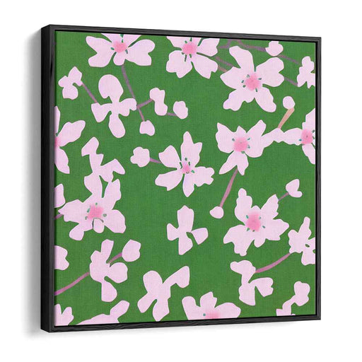 Petals on Verdant Canvas: Minimalist Cherry Blossom Pattern on Green Canvas Art Print