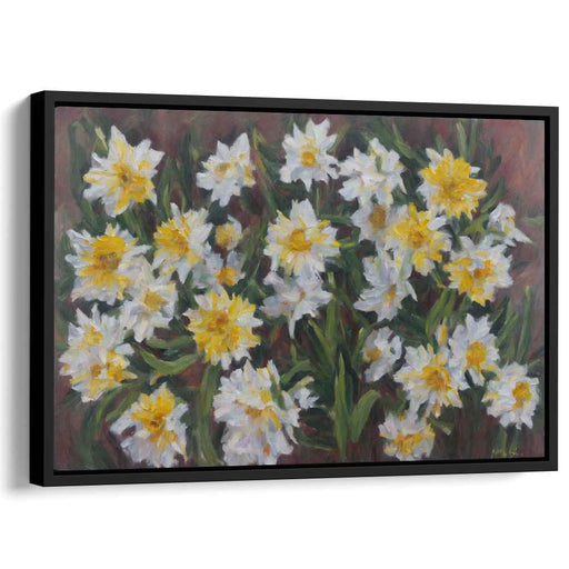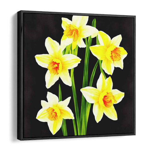 Glowing Blossoms in Shadows: Luminous Daffodils on Dark Canvas Art Print