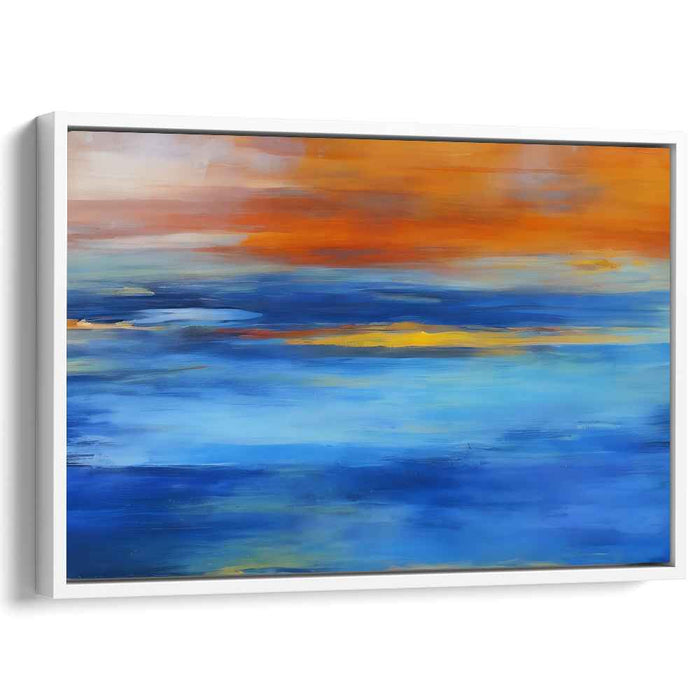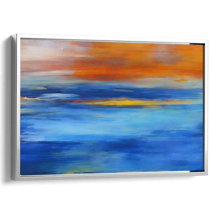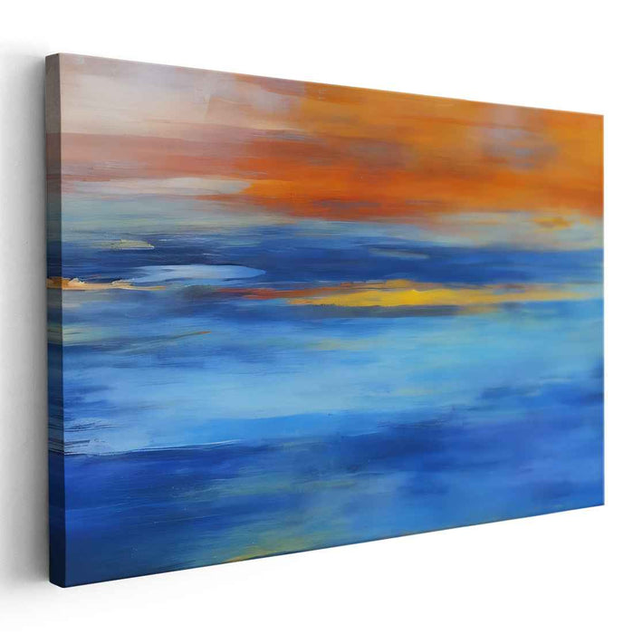 Introducing 'Abyssal Depths,' an enchanting abstract seascape canvas art print that mesmerizes viewers with a vibrant symphony of blues and oranges, encapsulating the serene yet dynamic essence of a seascape meeting a fiery sunset. This captivating artwork harmoniously blends a rich spectrum of blues with warm oranges, creating a striking contrast that evokes the tranquility of the ocean embracing the warmth of a setting sun.