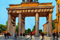 This contemporary piece exudes a sense of history, culture, and vibrancy, making it a perfect addition to any space seeking to evoke feelings of exploration and appreciation for architectural beauty. The artwork invites viewers to immerse themselves in the rich tapestry of the Brandenburg Gate's iconic presence and the lively interactions surrounding it.