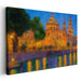 Introducing 'Architectural Brushstrokes Dance,' an enchanting canvas art that transports viewers to a mesmerizing scene of a historical architectural wonder illuminated by the soft glow of twilight near the water's edge. This captivating artwork exudes a magical ambiance, blending artificial lights with the natural beauty of dusk, creating a truly captivating setting.