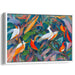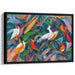 Introducing 'Avian Elegance: Vivid Bird Dance,' a mesmerizing canvas art print that transports viewers into a lively and colorful jungle teeming with vibrant avian life. This captivating artwork is a visual delight, showcasing a dynamic arrangement of birds depicted in vivid shades of white, orange, and blue set against a backdrop of lush green foliage.