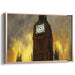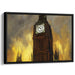 Introducing "Blaze Embers Dance: A Fiery Sunset," a mesmerizing canvas art print that captures the iconic Big Ben in a breathtaking display against a dramatic, fiery sky. This artwork is a symphony of rich, warm tones dominated by vibrant shades of orange and yellow, highlighting the clock tower's majestic presence against the backdrop of the tumultuous heavens.