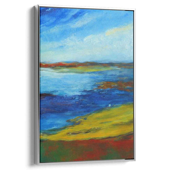 Introducing "Brushed Horizon Glow," an exquisite Impressionist landscape canvas art print that beckons viewers to a peaceful coastal haven, where the azure sky meets the calming sea in a symphony of colors. This captivating artwork portrays a vibrant blue sky adorned with delicate white clouds, mirroring the tranquility of a clear day. The sea, depicted in varying shades of blue, extends gracefully towards the horizon, its gentle waves instilling a sense of serenity. The shoreline, painted with lush greens and earthy browns, adds richness and contrast to the scene.